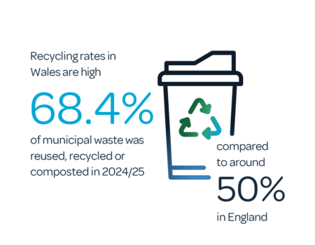 Wales leads the UK in recycling performance, achieving 68.4% (2024/25) recycling (Local authority municipal waste management: April 2024 to March 2025 [HTML] | GOV.WALES). However, to reach full circularity, focus must shift from recycling to designing out waste and keeping materials in productive use for as long as possible.