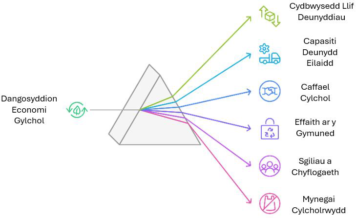 Mae’r newid i EG yn cael ei atgyfnerthu’n gryf gan Ddeddf Llesiant Cenedlaethau’r Dyfodol (Cymru) 2015, sy’n darparu fframwaith statudol ar gyfer meddwl hirdymor, atal, a stiwardiaeth adnoddau. Mae cysoni ymyriadau economi gylchol â saith nod llesiant Deddf Llesiant Cenedlaethau’r Dyfodol yn sicrhau nad yw EG yn cael ei thrin fel agenda annibynnol, ond fel mecanwaith craidd ar gyfer sicrhau llesiant cymdeithasol, amgylcheddol, ac economaidd ar draws gwasanaethau cyhoeddus a seilwaith.