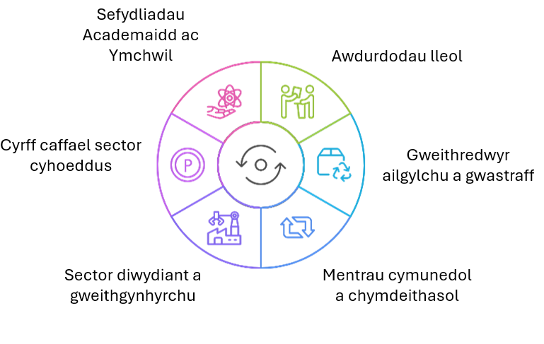 | Cydweithio | Mae partneriaeth agos rhwng llywodraeth, busnes, a chymunedau yn hanfodol i’r sector, gan alluogi syniadau newydd a’i gwneud yn bosibl i gynyddu graddfa arferion cylchol. |