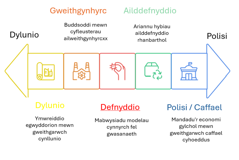 | Defnyddio | Arwain drwy esiampl trwy gaffael cylchol mewn adeiladau a seilwaith cyhoeddus. | Mabwysiadu cynnyrch-fel-gwasanaeth a modelau gwarantau estynedig. | Rhedeg mentrau atgyweirio, ailddefnyddio, benthyg a rhannu lleol. | Astudio ymddygiad defnyddwyr ac ymestyn oes cynhyrchion. |
